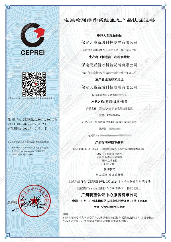 12月2日,保定天威新域科技發(fā)展有限公司自主研發(fā)的TWMG-100 固定式GIS局部放電在線(xiàn)監(jiān)測(cè)裝置,正式通過(guò)南方電網(wǎng)電鴻物聯(lián)操作系統(tǒng)生態(tài)產(chǎn)品認(rèn)證,成為實(shí)現(xiàn)"硬件+操作系統(tǒng)+應(yīng)用軟件"國(guó)產(chǎn)化的監(jiān)測(cè)裝備。這一突破標(biāo)志著我國(guó)電力設(shè)備狀態(tài)監(jiān)測(cè)技術(shù)擺脫對(duì)國(guó)外基礎(chǔ)軟件的依賴(lài),為新型電力系統(tǒng)建設(shè)提供了自主可控的方案。