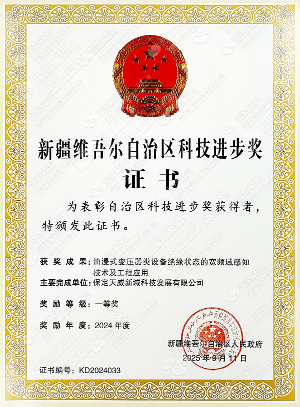 保定天威新域科技發(fā)展有限公司完成的“油浸式變壓器類設(shè)備絕緣狀態(tài)的寬頻域感知技術(shù)及工程應(yīng)用”項目,榮獲新疆維吾爾自治區(qū)科技進步一等獎。